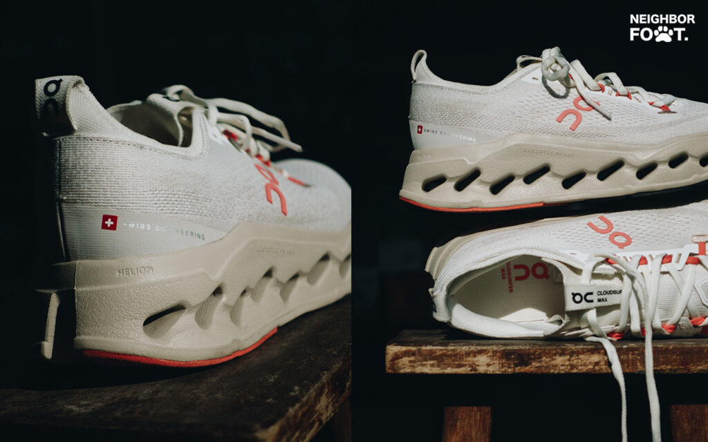 On Cloudsurfer Max ยังคงใช้โฟม Helion เป็นโฟมหลัก โดยรวมก็ยังให้ความรู้สึกเฟิร์มจนถึงแข็ง สำหรับคนเพิ่งเคยใส่ On ทั้งนี้ตัวโฟมไม่ได้มีแผ่นพลาสติกหรือ Speedboard ที่มักจะอยู่ในรองเท้าหลายๆ รุ่นของ On ออกแบบมาให้ใช้งานในการวิ่งระยะไกลได้ดีขึ้น โฟมไม่ยุบตัวง่ายๆ แต่นวดๆ ไปก็จะรู้สึกนุ่มขึ้นเอง มีดรอป 6 มิล (ปลายเท้า 31 มิล ส้นเท้า 37 มิล) และมีน้ำหนักประมาณ 300 กรัม (ไซส์ 9US)