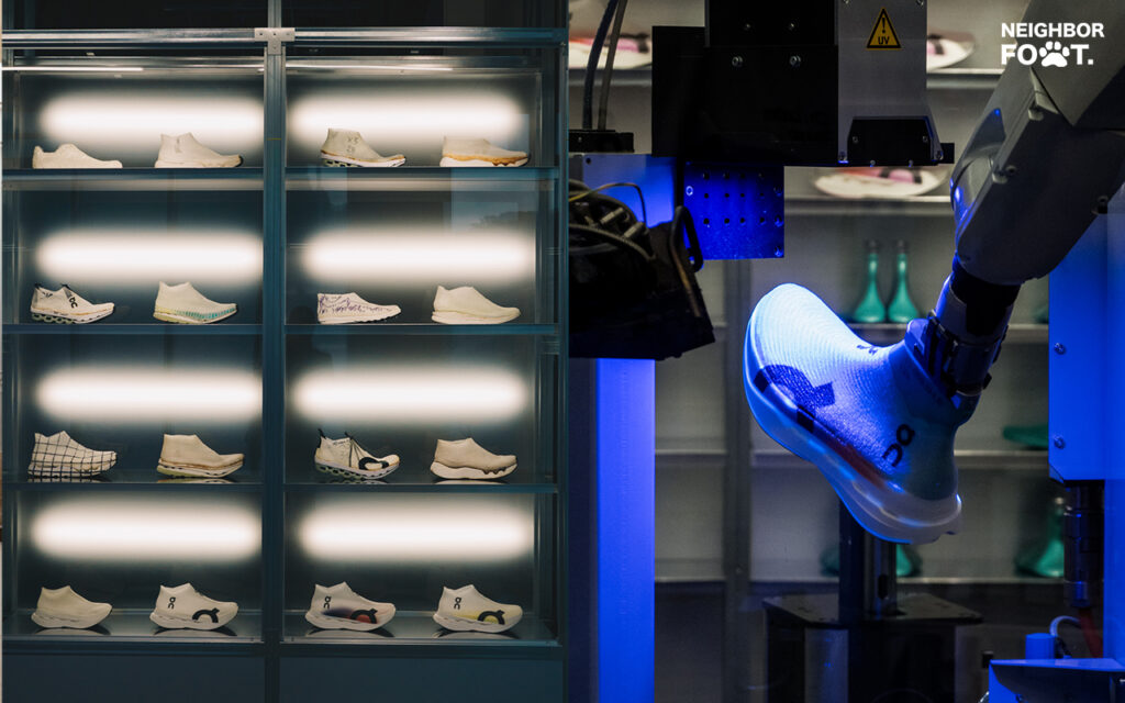 หลังจากพัฒนาอยู่หลายปี หุ่นยนต์ต้นแบบสำหรับพ่นเส้นใยหน้าผ้ารองเท้าได้ถือกำเนิดขึ้นในปี 2020 โดยสามารถพ่นใส่โมดูลเท้าโดยไม่ต้องใช้กาวเชื่อมกับพื้นโฟม กระบวนการนี้ใช้เวลาแค่ 3 นาที (ตัวเลขที่เขาเคลมไว้) แต่ที่ On Labs TOKYO เราลองทดสอบลองจับเวลาเล่นๆ ปรากฏว่าใช้เวลาประมาณข้างละ 7 นาทีเลยทีเดียว ทั้งนี้ทีมงานเขาบอกว่า Labs อันนี้เป็นแบบจำลองที่ทำขึ้นมาเลียนแบบ ของจริงจะไม่ได้เป็นแบบนี้เป๊ะๆ แต่จะใหญ่กว่านี้เยอะ