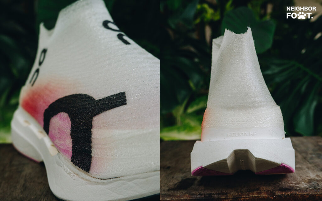 ฟิลลิ่งตอนสวม On Cloudboom Strike LS โดยเฉพาะกิโลแรกๆ จะรู้สึกว่ารองเท้ามีพลังมาก ถ้าคุมเพซไม่ดีมีแตก ถือว่าเป็นรองเท้าที่แรงจัดๆ คู่หนึ่งเลย และตอนที่เราไป Labs เขาให้เราทดสอบการกระโดดบนรองเท้ารุ่นนี้ ทั้งกระโดดขาเดียวและกระโดด 2 ขา ทำให้เห็นว่าโฟม Helion HF ช่วยแรงสปริงได้ดีจริงๆ ดูจากภาพด้านล่าง แม้รับน้ำหนักขาเดียว แต่โฟมแทบไม่ยุบตัวเลย พร้อมเด้งส่งตลอดเวลา